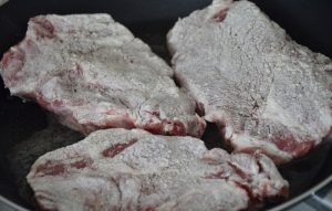 تغسل لحم الخنزير ، مقطعة إلى شرائح رقيقة ، تدحرج في الدقيق وتقلى بسرعة من الجانبين على نار عالية حتى الحصول على اللون البني.