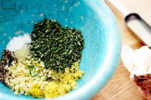 نضع الثوم المفروم ونكهة الليمون في وعاء إكليل الجبل المفروم ، زيت ، فلفل أرضي ، ملح (قرصان) و تخلط جيدا.