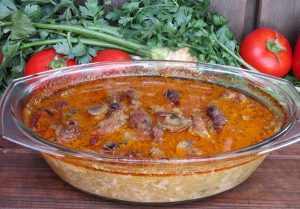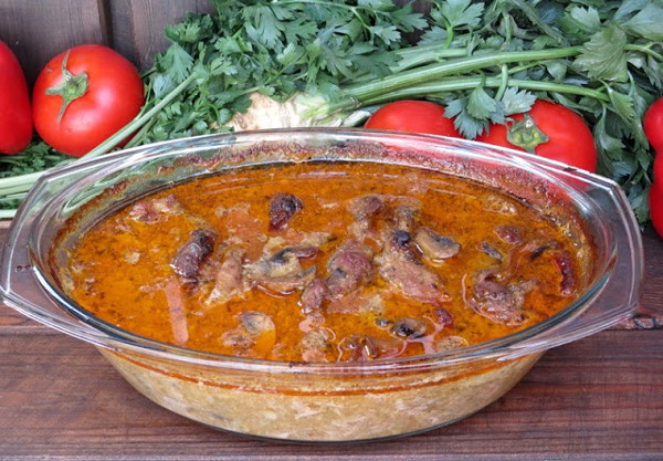 يقلى الفطر حتى يتبخر السائل ، يضاف الكاتشب ، كريم والخردل وتخلط. صب الدقيق ، الموسم المردقوش والفلفل المطحون والملح وسكب الماء (1 كوب) ، وجلب لتغلي ، جرب الملح وسكب الصلصة المعطرة في قالب من الرقبة.