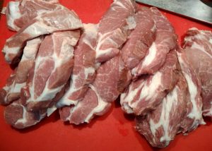 نحن نغسل عنق لحم الخنزير ، مقطعة إلى قطع متوسطة (12 قطعة) ، الملح والفلفل ووضعها في شكل عميق مقاوم للحرارة.
