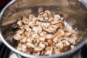 إلى الزبدة المذابة نرسل البصل المفروم ، يقلى لمدة 4-5 دقائق ثم يضاف الفطر إلى شرائح.