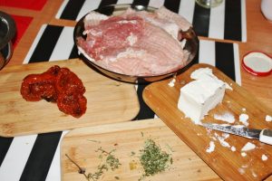 لفات لحم الخنزير اللذيذة محشوة بالمجففة سنطبخ الطماطم وجبن الفيتا في المنزل اليوم. لطبق نكهة تكمل مع الزعتر الطازج وللفائف رش الألوان الجميلة الفلفل الحلو ويخبز في الفرن. جعل أي طبق جانبي لفات ، انت تحبين