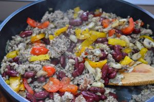 في الزيت على نار متوسطة ، يقلى لحم الخنزير المفروم لمدة 5-7 دقائق ، يضاف البصل المفروم والفلفل (للجمال ، يمكنك أن تأخذ لونين) ، الفطر والقلي لمدة 10 دقائق حتى السائل تتبخر. انتشر الفاصوليا والفلفل المطحون والريحان والملح إثارة.