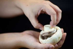 جبنة (50 غ) فرك جيدا في الدجاج مع الفطر ، يُضاف البقدونس المفروم ويُمزج ويُملأ قبعات شامبينون محضرة (ملعقتان كبيرتان لكل منهما).