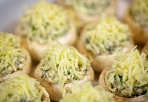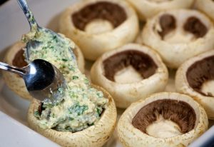 يرش الفطر المحشو بالجبن المبشور ويوضع فيه الفرن لمدة 20 دقيقة.