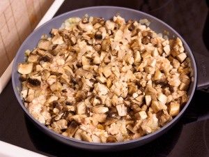 - ثم تضاف الفطر المفروم ناعما ، والملح قليلا و الفلفل ، يقلى معا لمدة عشرين دقيقة.
