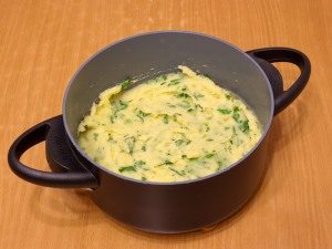 - يُمزج البطاطا المسلوقة مع هراسة البطاطس ويُضاف إليها كريم زبدة ، حليب دافئ ، خضار مقطعة ، طفيفة الملح والفلفل ، وتخلط جيدا.