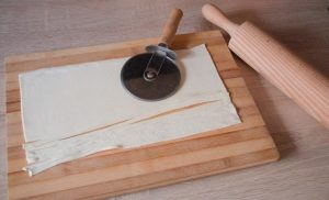 ضع معجنات النفخة على الطاولة قبل ساعة من البدء الطبخ. لفة العجين قليلا وتقطيعها إلى رقيقة شرائط. نضع الفرن على 200 درجة.