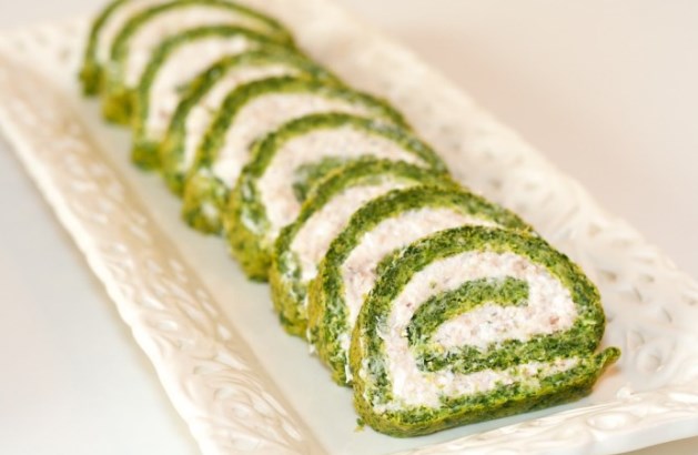فاتح الشهية الجميلة المذهلة على طاولة احتفالية من العجة مع سبانخ ، جبنة كريمة و تونة معلبة طبخ في المنزل ، هذه اللفائف اللذيذة ليست صعبة على الإطلاق ، والطبق كبير جدًا فاتح للشهية.
