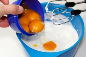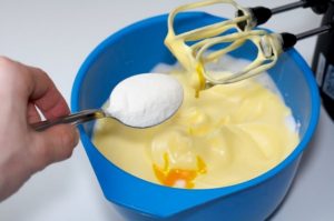 يضاف صفار البيض ، يدق ، يصب الدقيق ويخلط. نضع الفرن 180 درجة.