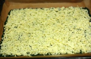 ننشر الجبن المبشور الخشنة على طبقة من السبانخ.
