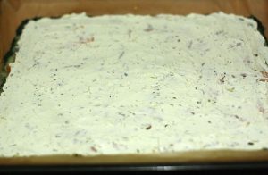 تذويب السبانخ والضغط وختم في وعاء الخلاط مع البيض والملح والفلفل المطحون. المزيج الأخضر المحضرة إرسالها إلى ورقة الخبز مبطنة بورق الخبز ، وبشكل متساو نوزع. نضع الفرن على 200 درجة.