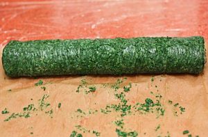 باستخدام الورق ، نحول القاعدة الخضراء مع السلمون والجبن لفة.
