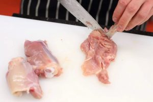 إزالة العظام والجلد من الفخذ الدجاج. يجب أن تبقى فقط لحم واحد.