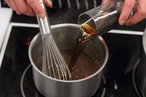 بعد دقيقتين ، أضيفي الشوكولاتة إلى المرق الساخن وحركيه ذلك حتى يذوب تماما. ثم صب نصف كوب فحم الكوك.