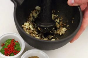طحن الثوم والكزبرة في هاون. الفلفل الحار والكزبرة ناعما قطع. ضعي كل هذه المكونات في ماء مالح وشوكولاته لخلط. ضعي الدجاج هناك.