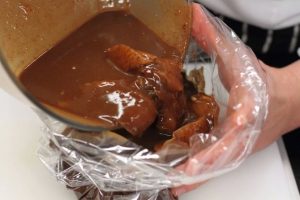 نقل الدجاج مع ماء مالح في كيس الخبز و اطبخه لمدة 40 دقيقة عند درجة حرارة 180 درجة. من الأفضل تناول هذا الطبق مع الأرز المسلوق.