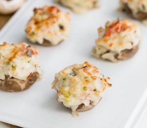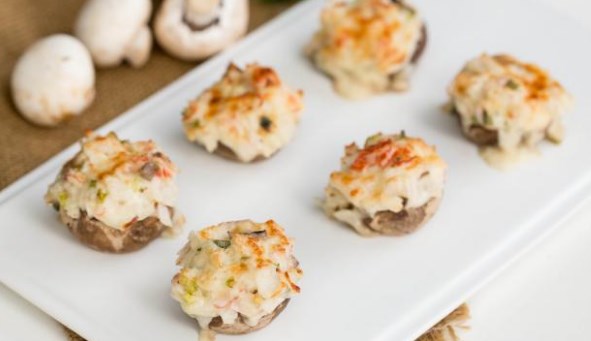 عبق ، فطر لذيذ محشوة بمزيج من السلطعون عيدان ، جبنة صلبة ، بصل أخضر ، ثوم ، مايونيز المطبوخ في المنزل في الفرن سوف تصبح زخرفة احتفالية الجدول.