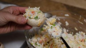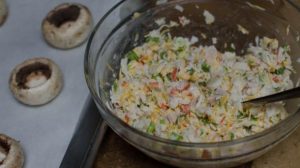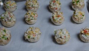 نملأ القبعات المعدة من الجبن بنكهة شامبيون تخلط مع العصي السلطعون وانتشرت على صينية الخبز الورق. ضعيها في الفرن لمدة 20 دقيقة.