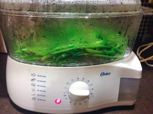 - يُضاف الفاصوليا إلى غلاية مزدوجة ، ويُرش بالبقدونس ويُطهى دقائق 8.