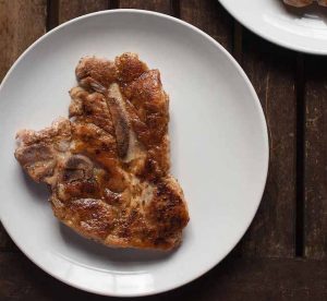 فرك شرائح لحم الخنزير مع مزيج عطري و ترسل إلى الزيت الساخن ، يقلى على نار متوسطة على جانب واحد 6-7 دقائق ، اقلب وأقلي 4 دقائق أخرى. نحن تنظيف في المقلاة والغطاء.