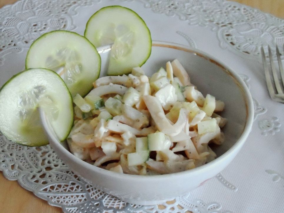 إذا كنت من محبي المأكولات البحرية ، فقم بإلقاء نظرة على هذه الوصفة. من الحبار يمكنك طهي سلطة لذيذة في المنزل! سلطة الحبار والخيار الطازج مزيج رائع الأذواق ، والخيار يعطي السلطة نضارة خاصة! افعل هذا سلطة للغداء أو العشاء ، أو على طاولة احتفالي.