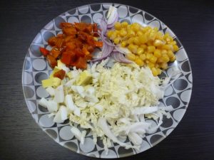 - نقطع البرسيمون إلى مكعبات وننزع البذور. يقطع البصل إلى الريش. أضف الذرة.