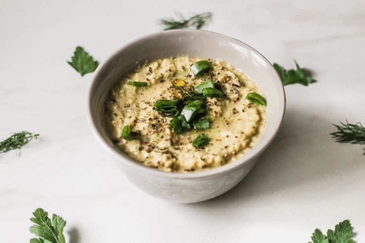 - أضف جميع المكونات إلى وعاء الخلاط واخفقها حتى التوحيد. يقدم مع زيت الزيتون أو الأعشاب.