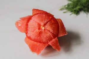 - احرق الطماطم بالماء المغلي واغمس في ماء ساخن لمدة 10 ثانية ، إزالة الجلد ومقطعة إلى أرباع.