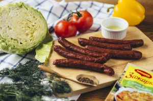 - يتم قطع النقانق إلى دوائر كبيرة. إرسالها إلى التسخين مقلاة مع الزيت النباتي ، تقلى قليلا.
