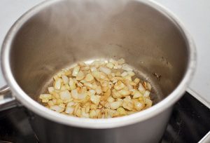 - في قدر منفصل ، يُقلى البصل على نار متوسطة ، ويوضع الثوم زيت الزيتون. يُضاف الباذنجان ويُسكب في الماء ويُحضر يغلي. طبخ لمدة عشرين دقيقة تحت الغطاء.