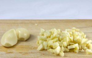 - على مقلاة جافة مع طلاء غير لاصق على نار خفيفة يُحرّك الثوم المفروم جيداً لمدة دقيقة واحدة.