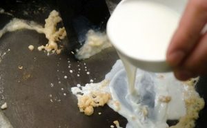 - يُسكب الدقيق في المقلاة ويُقلى حتى يصبح لونها بنياً ذهبياً.
