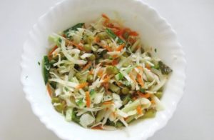 سلطة لذيذة مع الخيار والملفوف والجزر مذهلة سلطة الخضار مع إضافة البازلاء الخضراء ، وسوف تصبح هذه السلطة إضافة كبيرة إلى الكباب العصير. يمكن طهيها بسهولة. سواء في المنزل أو في الطبيعة أو في البلد. جعل هذه السلطة وتخدم لتناول وجبة خفيفة أو جنبا إلى جنب مع الرئيسي الطبق!