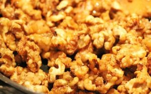 - نضع المقلاة على نار متوسطة ، ندفئها. رفض النار ويضاف نصف كوب من المكسرات و 1/4 كوب سكر. اثارة، جمهورية يوغوسلافيا الاتحادية. لا ينبغي أن يتحول السكر إلى سائل ، ولكن يجب أن يتحول المكسرات يكون في قشرة كراميل لذيذة. تبريد المكسرات الجاهزة.