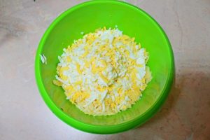 - خلط كل شيء ، إضافة الملح ، الموسم مع الأرض السوداء الفلفل ، إضافة الثوم ، مرت الصحافة. املأ كل شيء مع المايونيز وتخلط.