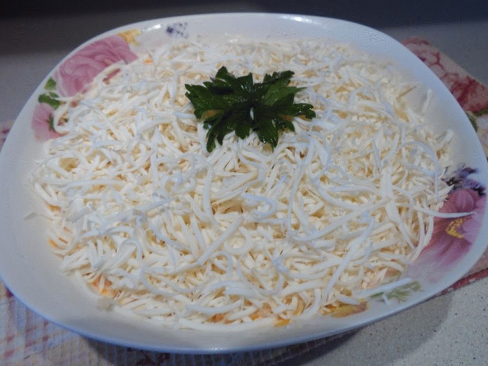 - فرك البيض على مبشرة ، والملح ، وضعت على التفاح و الشحوم مع المايونيز.