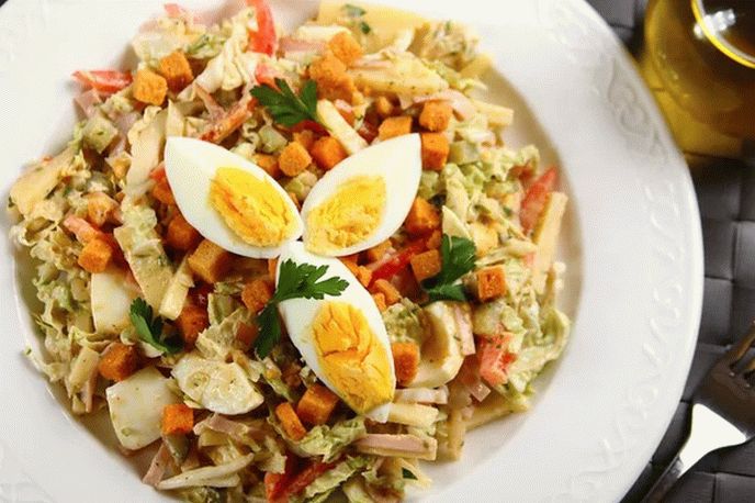 يُقطع الفلفل والجبن والباليك إلى شرائح. تغلي البيض مسلوق ، قشرهم ومقطّع إلى مكعب ، بيضة واحدة ترك للعرض. إضافة جميع المكونات إلى وعاء مع الملفوف.