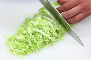 يقطع الملفوف الصيني على قش رفيع. النرد المعلب الخيار والبصل – صغير جدا مكعبات. ضع كل شيء في وعاء.