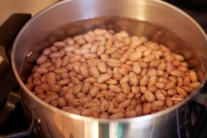 - نقع الفاصوليا في الماء البارد لمدة 8 ساعات. استنزاف الماء اغسل الفاصوليا ، صب 1.5 لتر من الماء ، واترك ليغلي طبخ لمدة 2 ساعة. نترك بعض الفاصوليا للزينة.