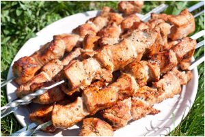 لحم تركيا صحي جدا وهضمه جيدا. الموصى بها للأشخاص الذين يعانون من الهضم الحساسة كباب تركي. شطف جيدا وإعداد شرائح – إزالة الفيلم والشرائط. قطع اللحم إلى أجزاء صغيرة. صر الثوم ، امزجه مع الملح والخضروات الزبدة والتوابل: القفزات سونيلي ، adjika الجافة ، السترون ، الفلفل الحلو ، الفلفل. ضعي شرائح اللحم في ماء مالح واتركيه هناك. لبضع ساعات. ضعي اللحم على أسياخ وشوي على الشواية. 15 دقيقة حتى جاهزة.
