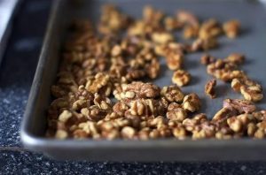 - قشر الجوز. سخن الفرن إلى 190 درجة. ضعي المكسرات على صفيحة الخبز ودفئي لمدة تتراوح بين 8 و 10 دقائق حتى اللون الذهبي.