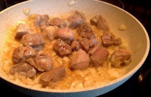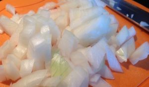 - مقلي الخروف. يُضاف البصل ويقلى لمدة خمس دقائق.