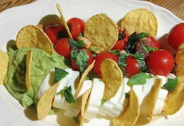 - يُقدّم الطبق – يُوزّع الطماطم المقلية والثوم ، بجانب جبن موزاريلا مع رقائق الذرة و guacamole. مسحوق أوراق الريحان ، تمزيق الأيدي.