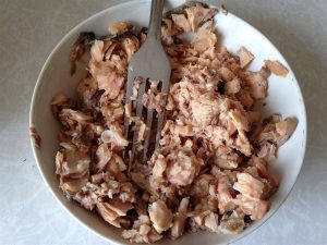 هريس الأسماك المعلبة مع شوكة ووضعها في الجزء السفلي من مجزأة الأطباق.