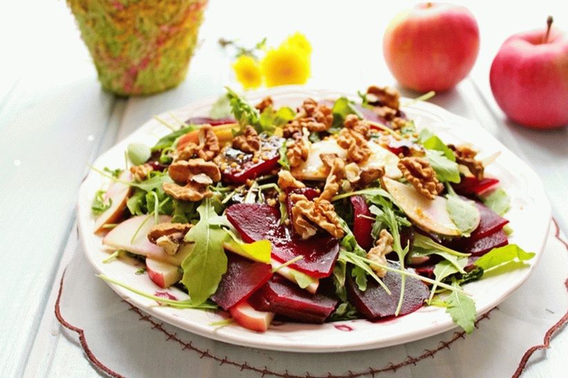 أوصي لطهي الطعام في المنزل سلطة لذيذة مع التفاح والشمندر و الجوز. تسليط الضوء على السلطة هو خلع الملابس – مزيج لا يصدق من مجموعة واسعة من النكهات التي يسهل صنعها حسب هذه الوصفة