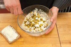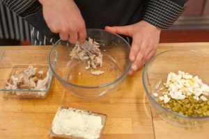 في وعاء منفصل ، يجب سحق السمك بالشوكة و أضيفي المايونيز واخلطيها مرة أخرى.