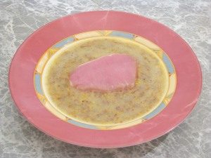 - لفة شرائح لحم الخنزير شرائح في لوحات ، سميكة حوالي واحد سم من الخردل الخليط.