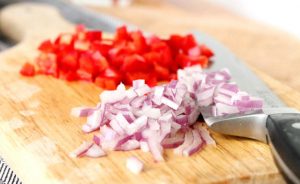 - نقطع البصل والطماطم إلى مكعبات صغيرة.