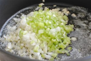 - في قدر ، يُسخّن الزيتون والزبدة ويقلى البصل والثوم والكرفس 4-5 دقائق.